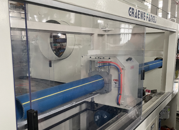 Viertens wird das Rohr von der Raupenzugmaschine gezogen und in den Schneider geschickt, wo das Rohr entsprechend der voreingestellten Länge abgeschnitten wird; Gleichzeitig wird der Schneidstaub durch den Staubentferner entfernt.